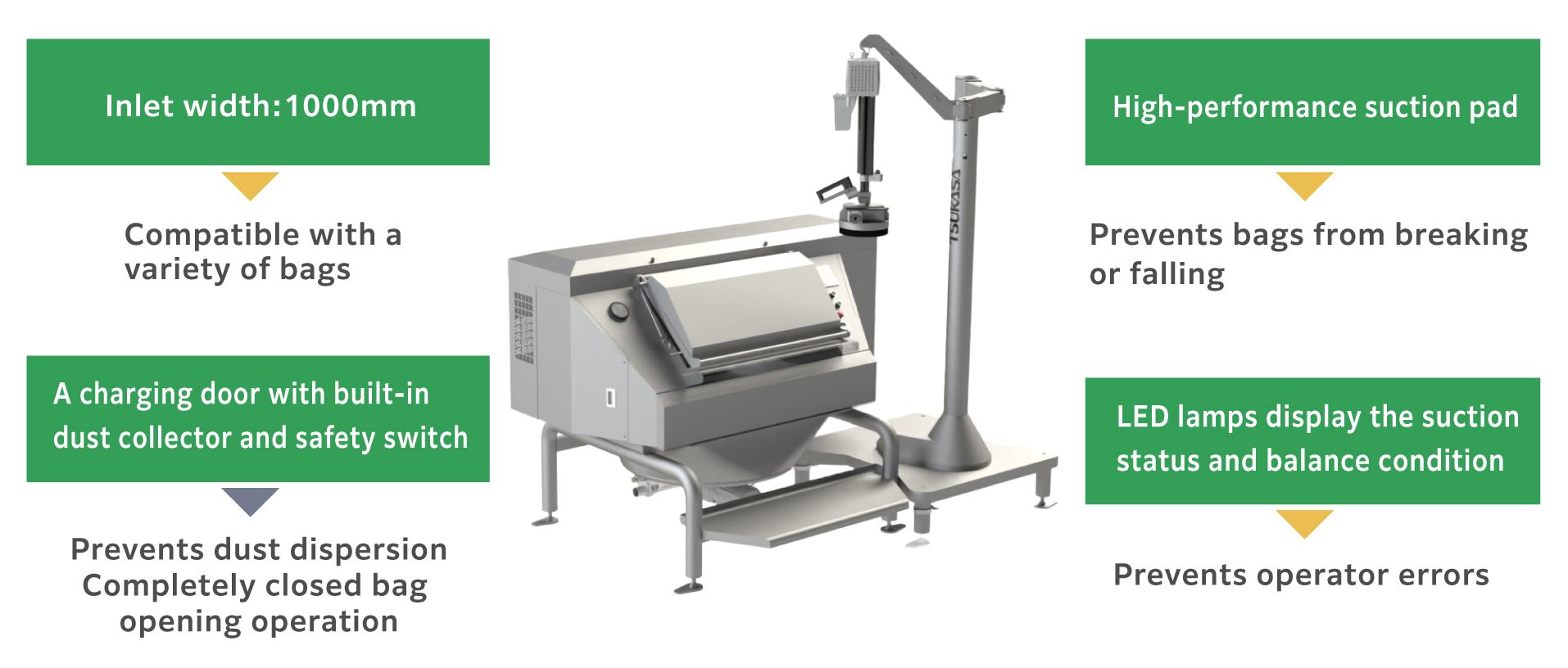 An operator lifts raw material bags and opens them manually. We want to automate this heavy task, but the processing volume at the factory is not very large. TSUKASA presents a new product for 2025 designed specifically for such customers.