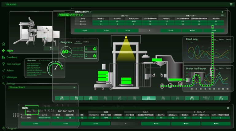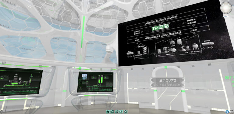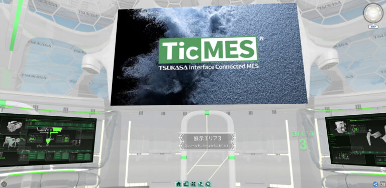 本エリアでは、弊社独自開発の製造実行システム 「TicMES(ティクメス)」 によって、プラントの稼働をリアルタイムで 指示・管理・可視化 し、粉体の流れやコントロール状況、進捗確認などをVR上で体感いただけます。