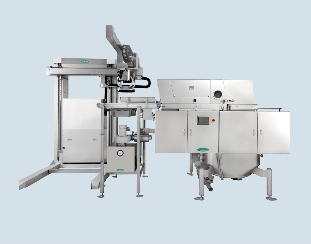 ロボットによる原料袋の供給、自動開袋と原料の取り出し、異物除去などの機能を1つのユニットにまとめたツカサならではのシステムです。