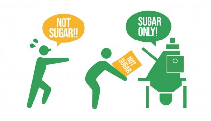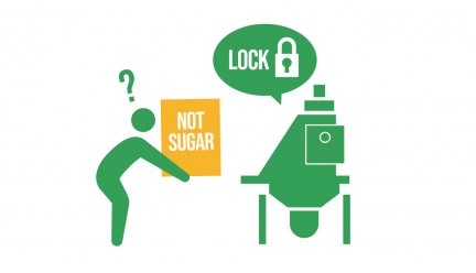 粉体原料を各種機器に投入する時に、その種類(小麦粉、砂糖、添加物など)を間違えるトラブルがしばしば発生していました。原料投入口に「砂糖in」などと貼り紙をしていても、複数の種類の粉体を1日に何度も入れ替えるため作業者のポカミスが完全には防げません。「あっ、間違えた!」と慌てて投入を止めるリスクを何とか減らせないかとのご相談がありました。