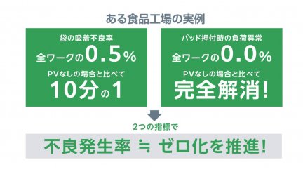 「袋の吸着不良の発生が全体の0.5%以下」「ピッキングミスによるロボットの衝突や負荷異常がゼロ」に改善。不良発生率ゼロ化に向けて大きく前進できました。