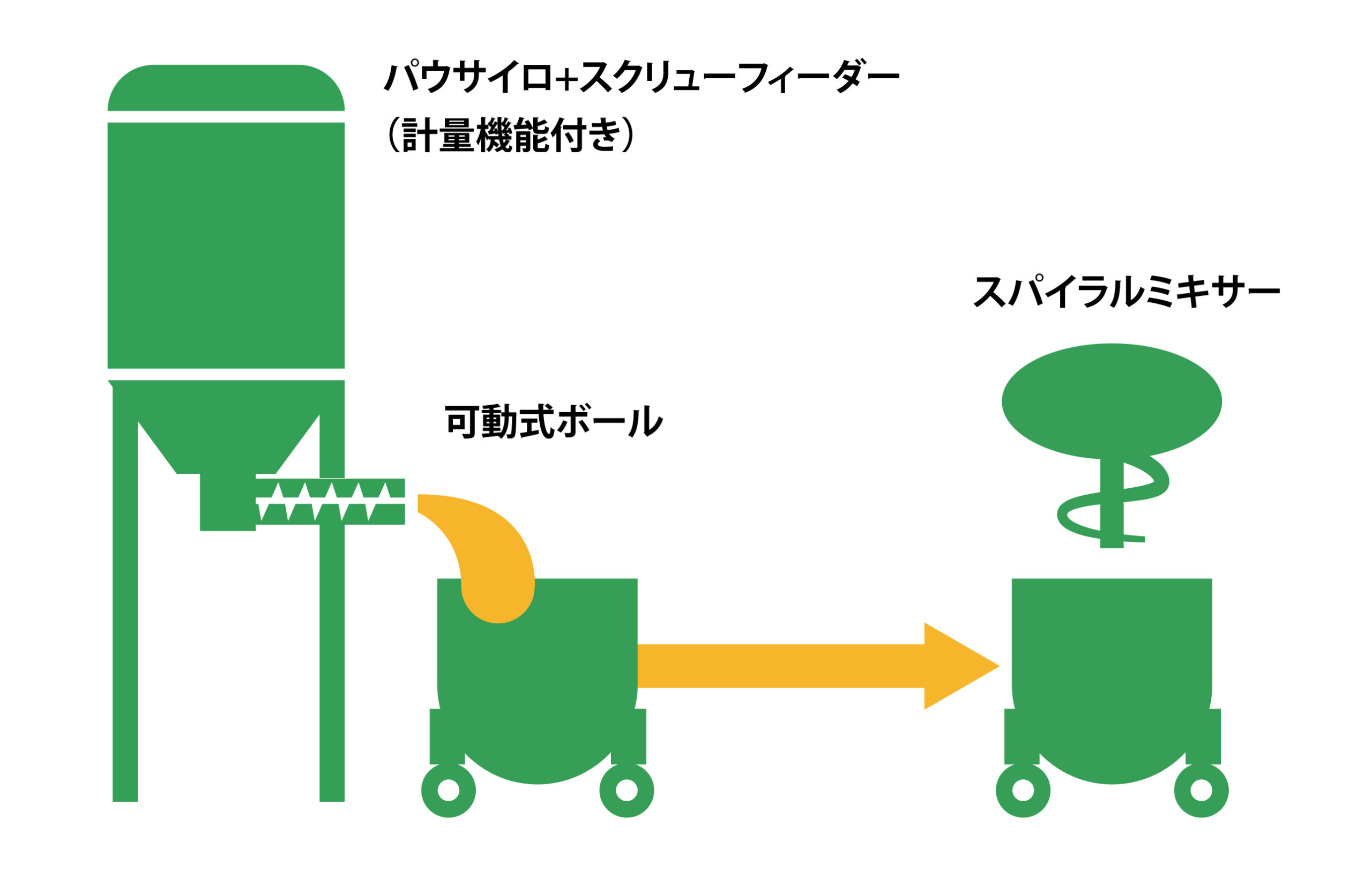 「パウサイロ」にストックしておいた粉体原料を1バッチごとに自動計量して、ボールに供給することをご提案しました。