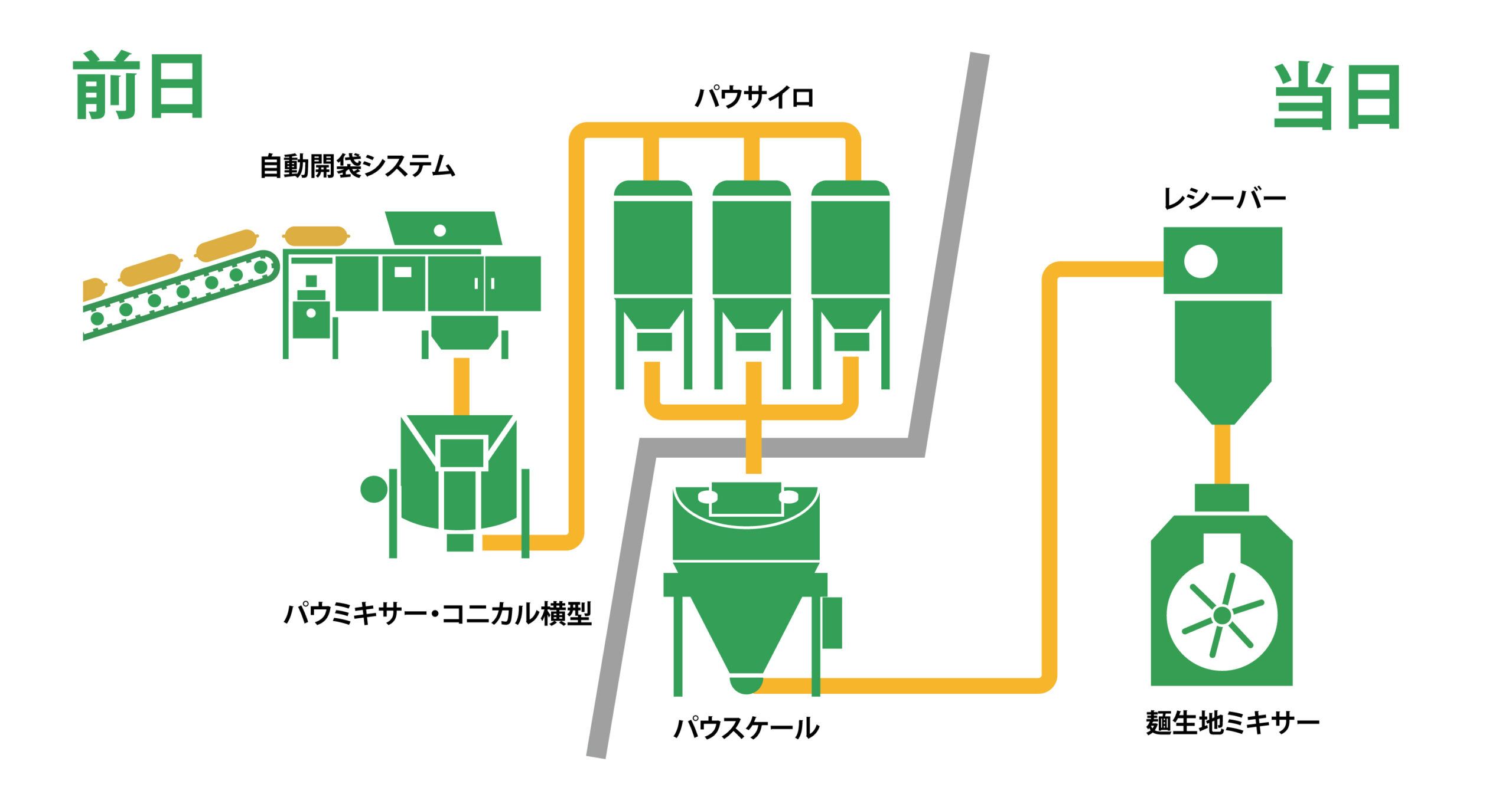 小麦粉や添加物など粉体原料を前日混合しておき、翌日すぐに麺生地ミキサーに投入できる体制をご提案しました。