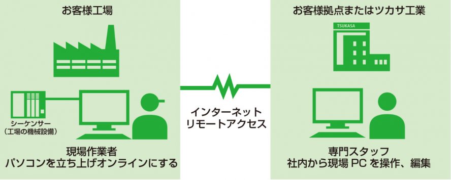 リモートツールを活用して、ツカサ本社から海外現地のお客様工場のパソコンにアクセス許可を得て、プログラム送信やシーケンサーの制御確認・修正を遠隔操作で行いました。