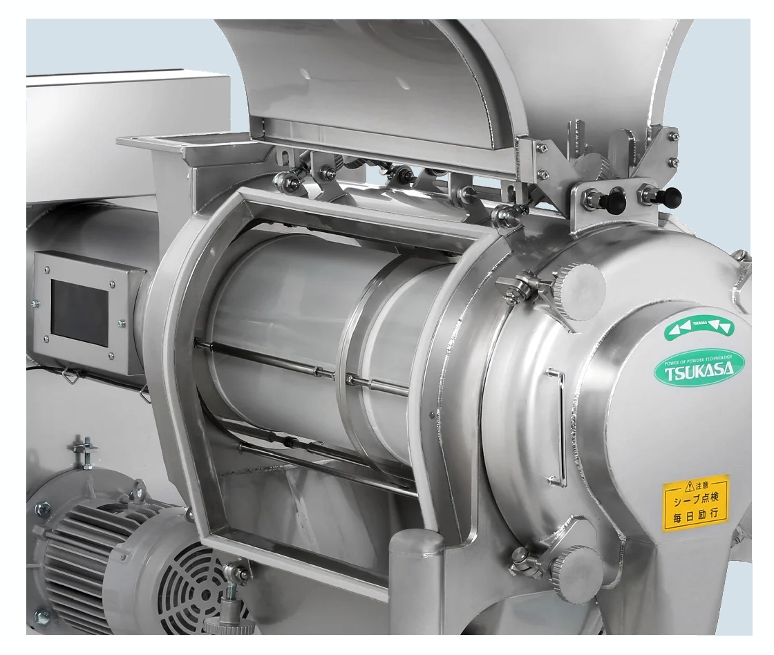 粉体機器の点検・清掃で「いかに簡単に分解して洗えるか」に加えて「毎回分解しないでも対応できる作業はないか」を常に考えて開発を進めています。ガルウィング型の点検口を搭載した「パウシフター・特殊仕様」は、そんなTSUKASAの基本姿勢が具体的な製品となった一例です。