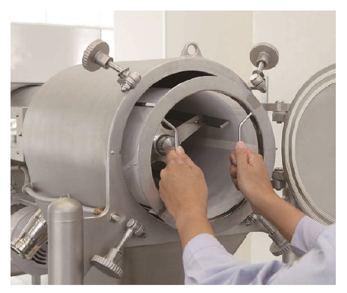 ラインシフターでは、本体内部の円筒型シーブ(網)の洗浄も点検扉を開けてシーブだけを引き出せば簡単にできます。特別なスキルや工具は必要ありません。また、網の張り替えも短時間で可能です。