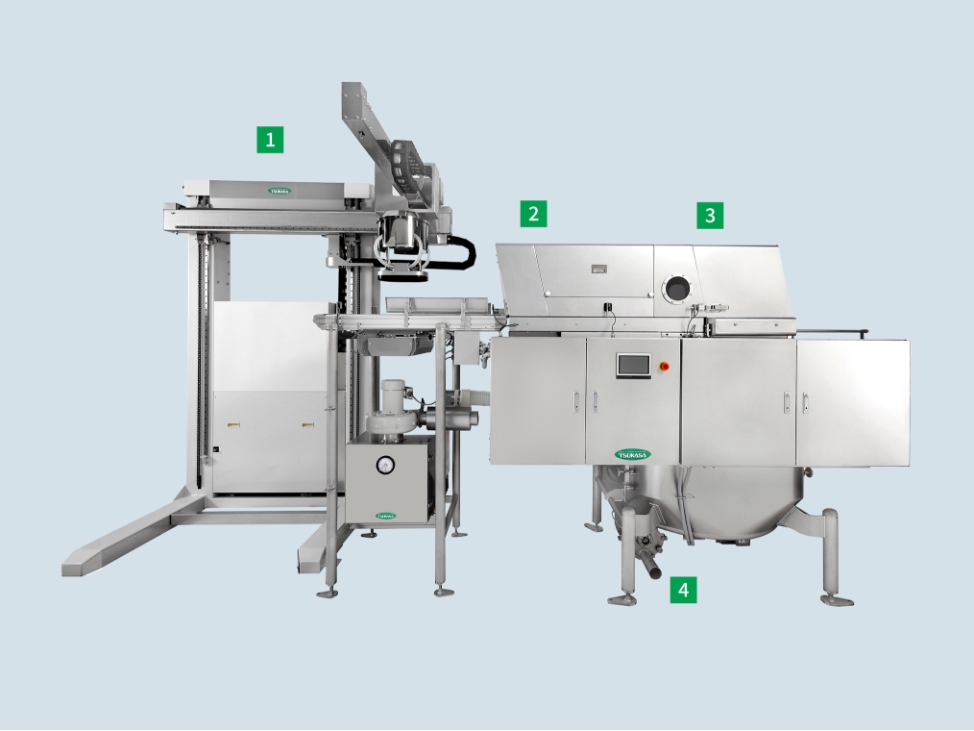 Ein System mit Funktionen zur Sackzufuhr, Oberflächenreinigung und Sacköffnung