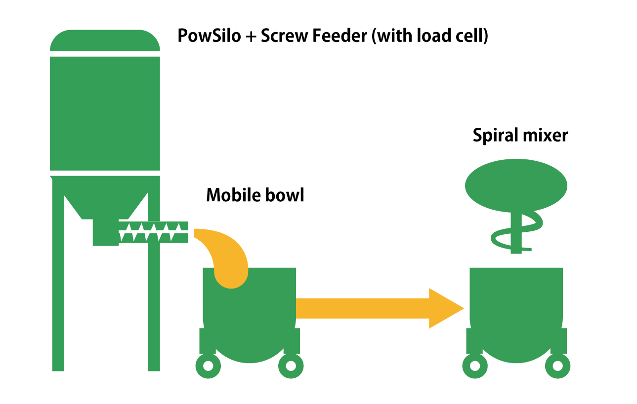 Just place a bowl near the spiral mixer to receive the powder material, set it as it is and it is ready to be put into the dough mixer. The trouble of rolling the trolley from the weighing room was eliminated.
