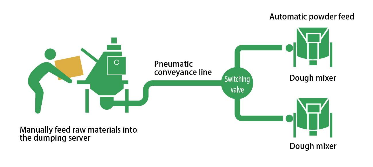 We proposed that pneumatic conveyor piping should be used to connect the receiving of raw materials at the "dumping server" to the mixer. In this way, raw materials can be fed through common piping up to the front of the mixer and automatically fed into multiple mixers by means of a switching valve.