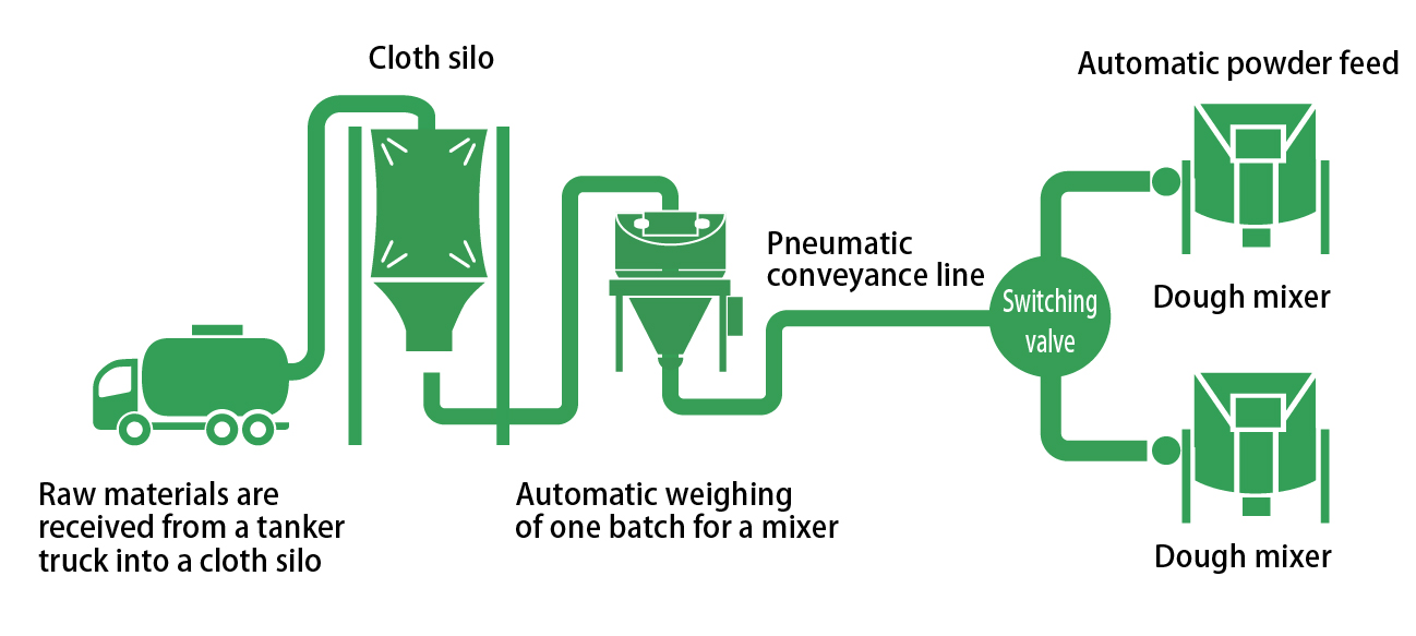 Raw materials are received from the tanker truck into the indoor "cloth silo" and stored. A "PowScale (weighted weighing equipment)" or branch valve can be installed in the pneumatic conveyor piping to separately feed raw materials for only the specified weight to multiple mixers. It is also possible to remove foreign matter with "LINESIFTER®" and "PowMagnet" installed in the line.