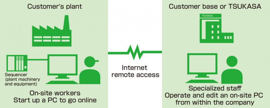 Using remote tools, we obtained permission to access PCs at customers' overseas plants from TSUKASA's head office and remotely sent programs and checked and modified the sequencer control.