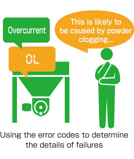 An inverter is used to control motors in TSUKASA's main equipment. On its display panel, you can check error codes (the details of failures) when the equipment stops due to overload.