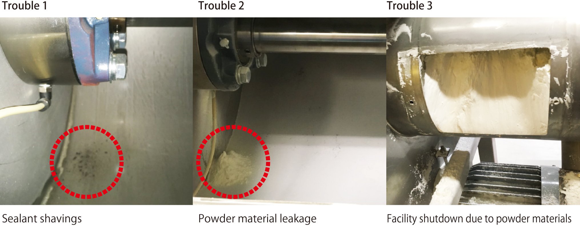 The occurrence of shavings indicates a sign of a powder leakage. If left as is, the powder materials will eventually leak out, causing serious problems such as powder spewing and facility shutdown.