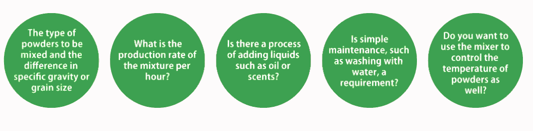 In food manufacturing plants that use powders as raw materials, there is a process of mixing powders and granules together. It is important to select the most suitable mixer according to the characteristics of the material to be mixed, the mixing time, and the operation method.
