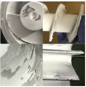 When removing the inspection port or side plates of the equipment, powder materials may be stuck on the inside of the flange, growing into sharp-edged shapes (e.g. granulated sugar). Carelessly inserting your hand may result in getting an unexpected injury. Use a scraper, etc. to carefully remove the stuck powder before carrying out any work. In addition, note that rubber plate packing that has hardened due to aged deterioration can also cause injury.