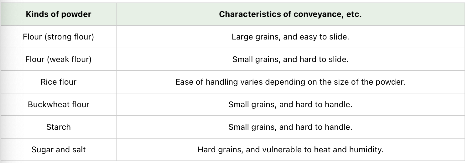 Each individual grain of a powder has various characteristics depending on the size of the grain (grain size), shape, weight (bulk specific gravity), fluidity and included water content. Methods and routes for conveying powder in food plants, etc. need to be designed carefully according to characteristics of the raw material powder.