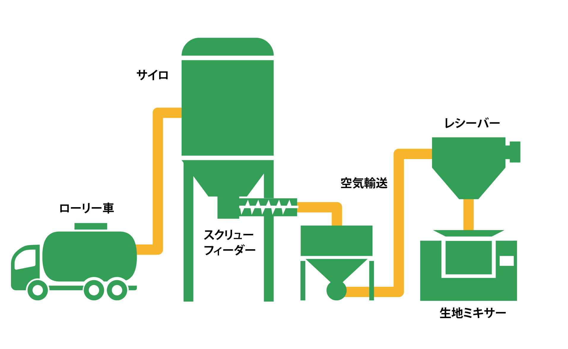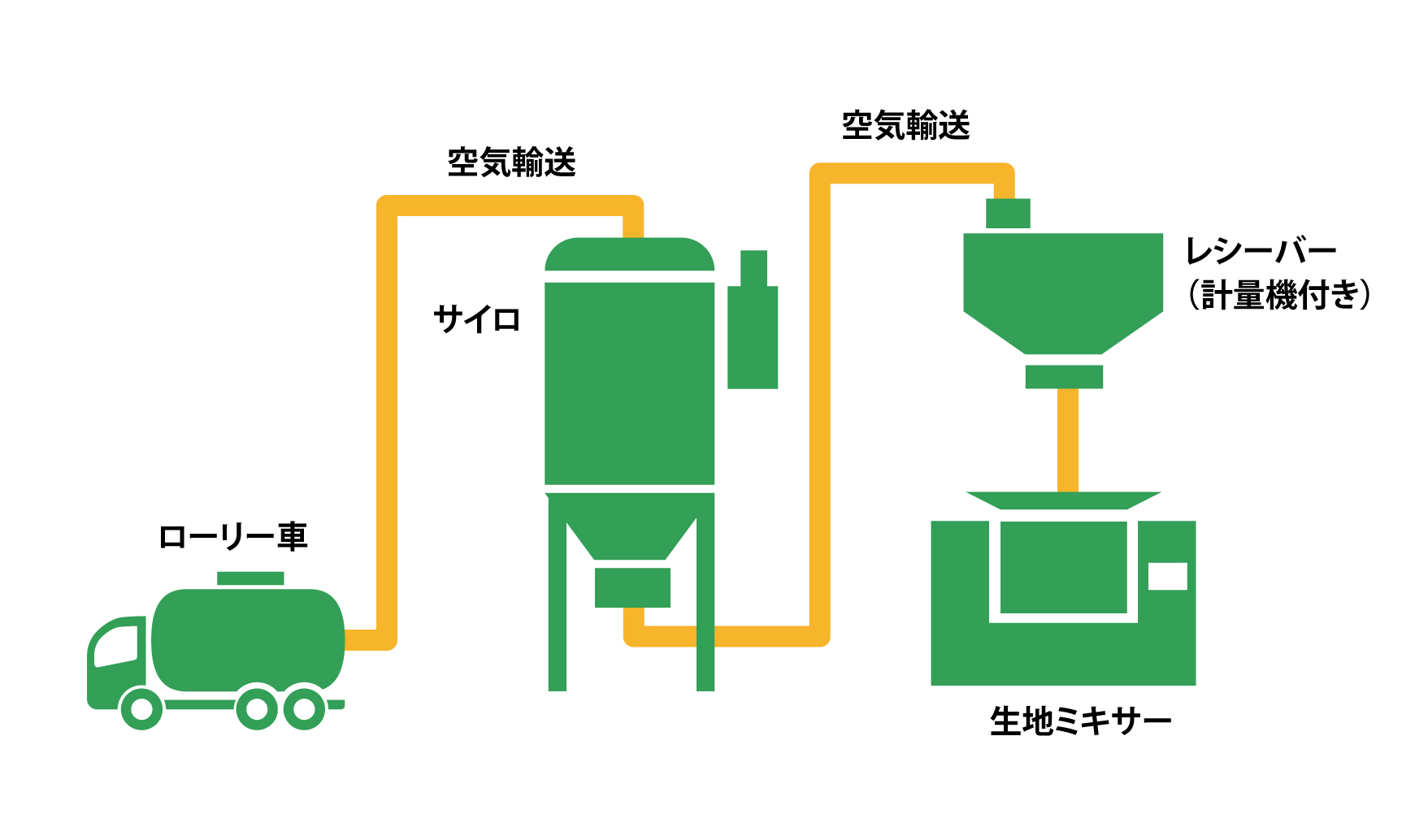 生地ミキサー上部にレシーバー(計量機付き)を設置。原料をサイロから排出しながら、送り先で計量を行います。サイロ下部に計量機(パウスケール)を設置する必要がないため全体の機器数が減り、省スペースで導入コストも抑えることができます。