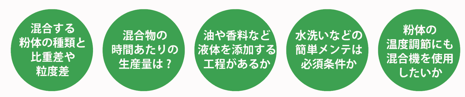 粉体を原料とする食品の製造工場では、粉体や粒体同士を混合する工程があります。混合したい原料の特性や混合時間、運用方法にあわせて最適な混合機を選定することが大切です。