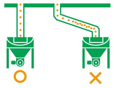 上階の機械の設置場所の真下に、次に粉体を送る下階の機械があれば問題ありません。しかし2つの機械の位置が離れていれば、配管の角度が緩やかになって自重落下の効率は下がります。ここを優先的に設計して角度を十分に確保し、それにあわせて他の配管ルートを決めれば全体として高効率なレイアウトができます。