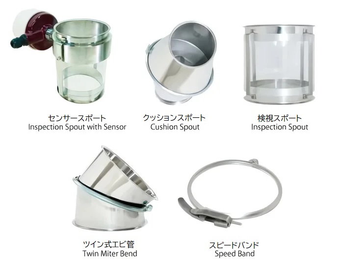 TSUKASAの配管部品には、配管の詰まりを自動検知する「センサースポート」や、輸送中の粉体の様子を目視できる「検視スポート」、高所から落下した粉体の速度を緩める「クッションスポート」、工具不要でワンタッチ取付・取外しができる「スピードバンド」、0°〜45°まで自由に角度が変えられる「ツイン式エビ管」など多彩なラインアップがあります。生産現場の状況にあわせてぜひご検討ください。