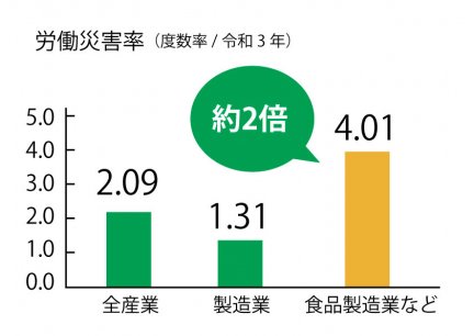 粉体の入った袋を人手で持ち上げ、中身を開いて加工機に投入するのは重労働です。製造業の労災発生率は全産業と比べて高く、食品メーカーではさらに高率となります。