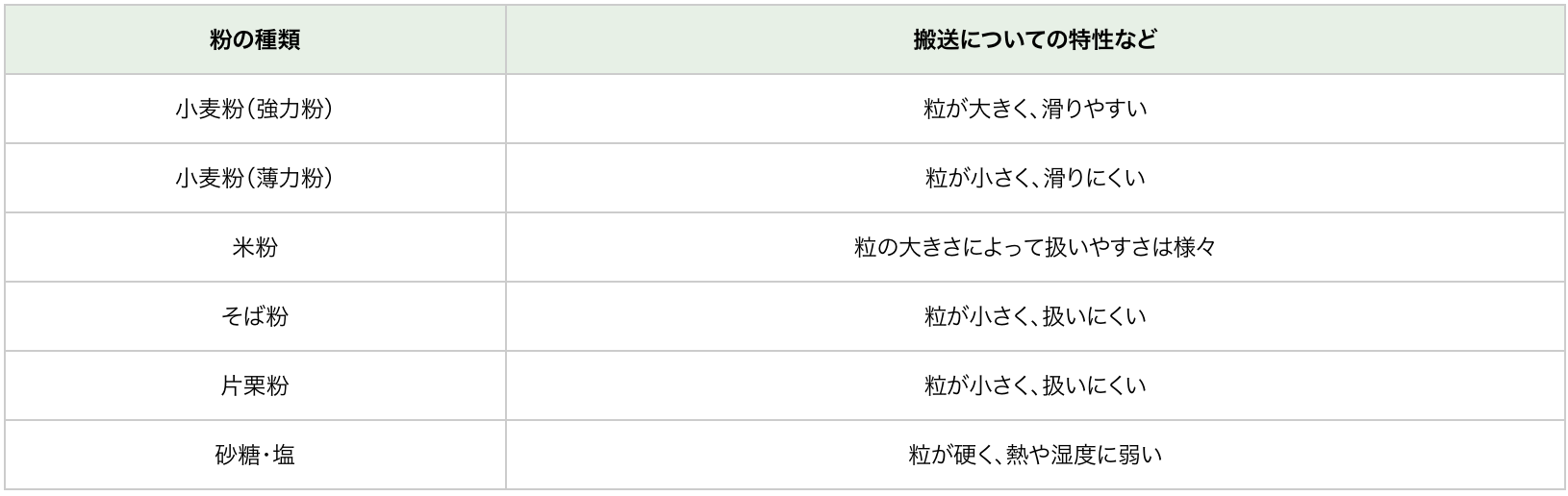 粉の傾向としては、粒の大きい粉のほうが搬送しやすく、粒が細かいものは湿りやすく滑りにくい特性をもち、静電気も起きやすくなるため搬送しにくくなります。