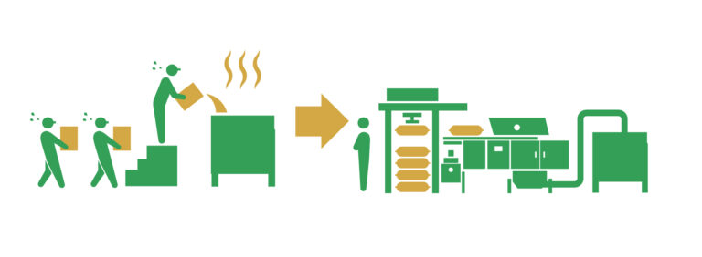 紙袋入り粉体原料を溶解タンクに直接手投入するという重作業の改善策をご提案。主原料は自動化、副原料は手作業にわけて効率的に対応するための手法についてご紹介します。