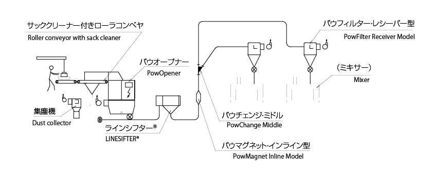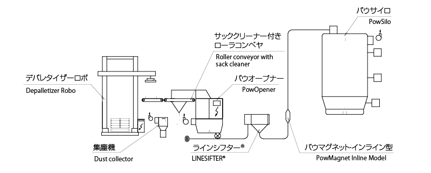 ⚫︎開袋給粉工程に必要な袋の供給、袋表面の清掃、開袋、空袋処理の機能を一つのユニットに組み込んだコンパクトなシステムです。