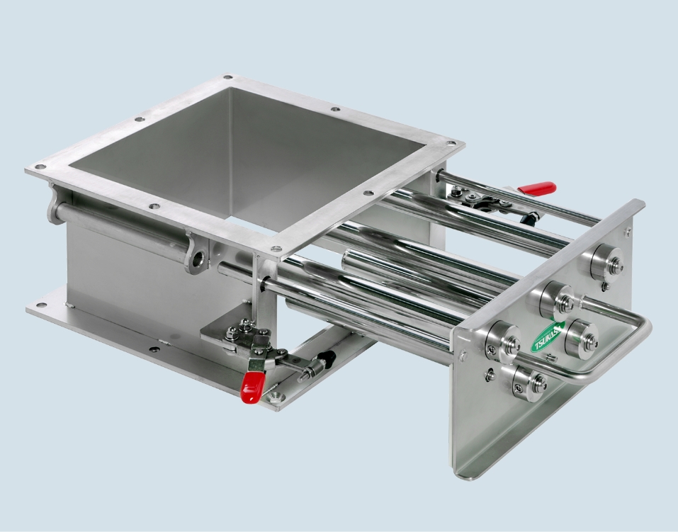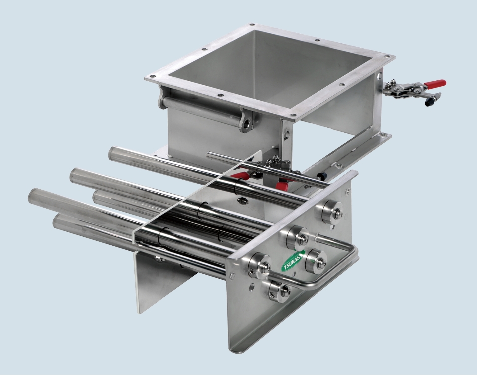 ふるい分け・異物除去工程高効率なふるい分け・異物除去が可能 高効率なふるい分け・異物除去が可能 この工程をイラスト図解 異物除去装置 パウマグネット・ゲート型(MG2) 機器やタンクの投入・排出口に設置可能な磁性異物除去装置 ※写真はリムーバブルタイプ 特長 ⚫︎機器及びタンクなどの投入口、または排出口に設置し、鉄片・鉄粉などの金属製異物を除去。 ⚫︎ワンタッチでマグネットの取り外し可能で、点検や清掃が大変簡単。 ⚫︎強力永久磁石(ネオジム系)マグネットの有効面磁束密度は、1.3T(max)。 ⚫︎異物除去が容易なリムーバブルタイプの選択も可能。ただしマグネットカバーの装着時有効面磁束密度は1.0T(max)。 一覧に戻る