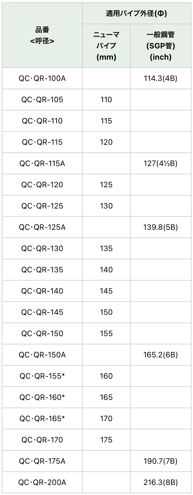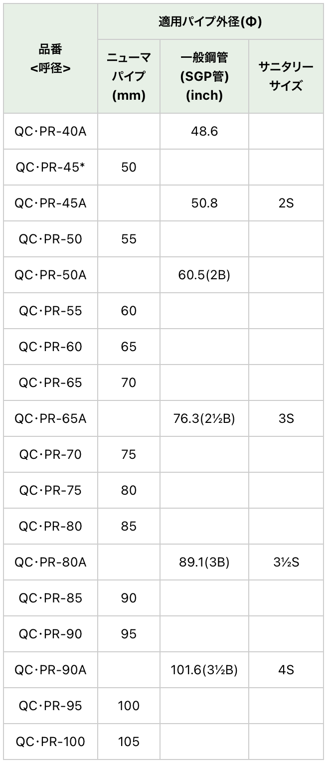 バルブ&配管部品互換性に優れた多種多様なバルブ・配管部品 互換性に優れた多種多様なバルブ・配管部品 この工程をイラスト図解 ニューマ部品 接続ゴム(PR・QR) 用途 / 仕様 ⚫︎クイッククランプ(QC)の接続用ゴムとして使用します。 ⚫︎材質:エチレンプロピレンゴム(EPDM・黒)。 QC・PR-40~100 QC・QR-105~200 呼径 QC-45~100は長さ100mm、QC-100A~200Aは150mmです。 *印は受注生産品となります。 一覧に戻る
