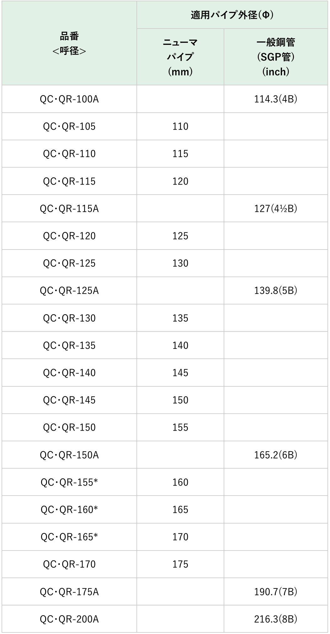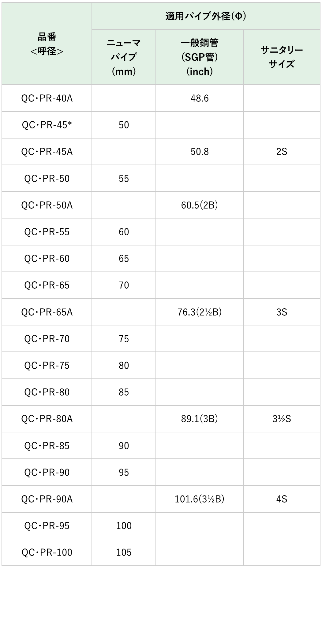 バルブ&配管部品互換性に優れた多種多様なバルブ・配管部品 互換性に優れた多種多様なバルブ・配管部品 この工程をイラスト図解 ニューマ部品 クイッククランプ(QC) 用途 / 仕様 ⚫︎配管用バンド接続クランプです。 ⚫︎粉粒体空気輸送配管。局所排気やサニタリーダクト等、幅広い用途に対応。 ⚫︎接続ゴムとあわせてご使用ください。 ⚫︎吸引・圧送配管のいずれにも適しています(最高許容圧力98kPa)。 ⚫︎材質:ステンレス ボルト・ナット・シャフト…スチール(メッキ仕上) ※取り付け・取り外しには六角レンチ(6mm)が必要です。 QC・PR-40~100 QC・QR-105~200 呼径 QC-45~100は長さ100mm、QC-100A~200Aは150mmです。 *印は受注生産品となります。 一覧に戻る